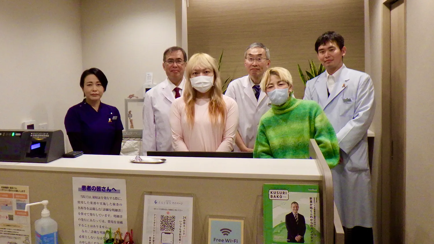 受付で撮影した記念写真。左から、中川看護師、白阪医師、